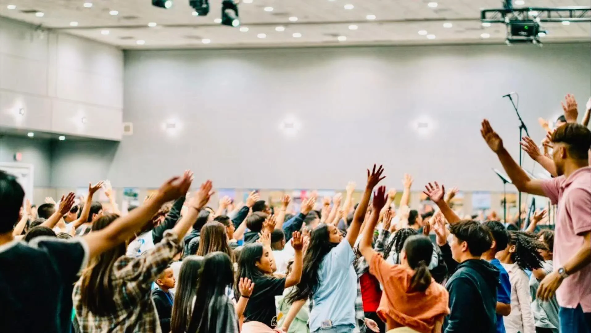 Large indoor event with many people raising their hands, facing a stage with speakers and musicians. Banners read 'The King's Army' and 'History Makers'.
